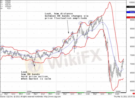 Aquí puede ver, cuando el mercado estaba en calma, la distancia entre las líneas era más estrecha. En 2007, las fluctuaciones del mercado se hicieron más amplias, por lo que se incrementó la volatilidad y luego se amplió la distancia entre las bandas BB. Durante el colapso de 2008, el mercado estaba muy ruidoso: la distancia de las bandas se ha vuelto realmente amplia.