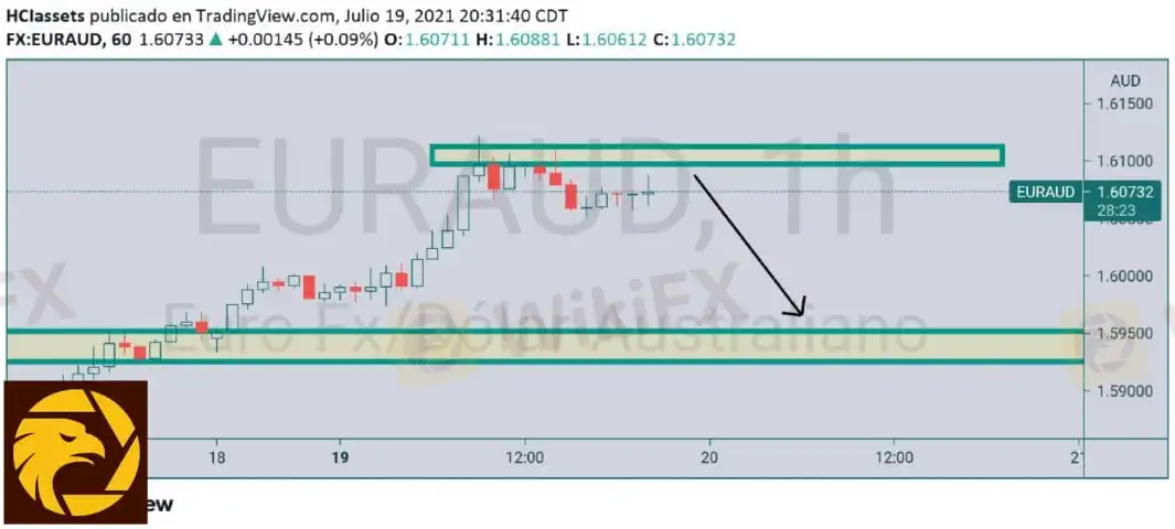 EURAUD doble techo marcado claramente con zona de objetivo este par va en tendencia alcista pero podemos operar los retrocesos en este caso buscaremos ventas a partir del precio 1.60680