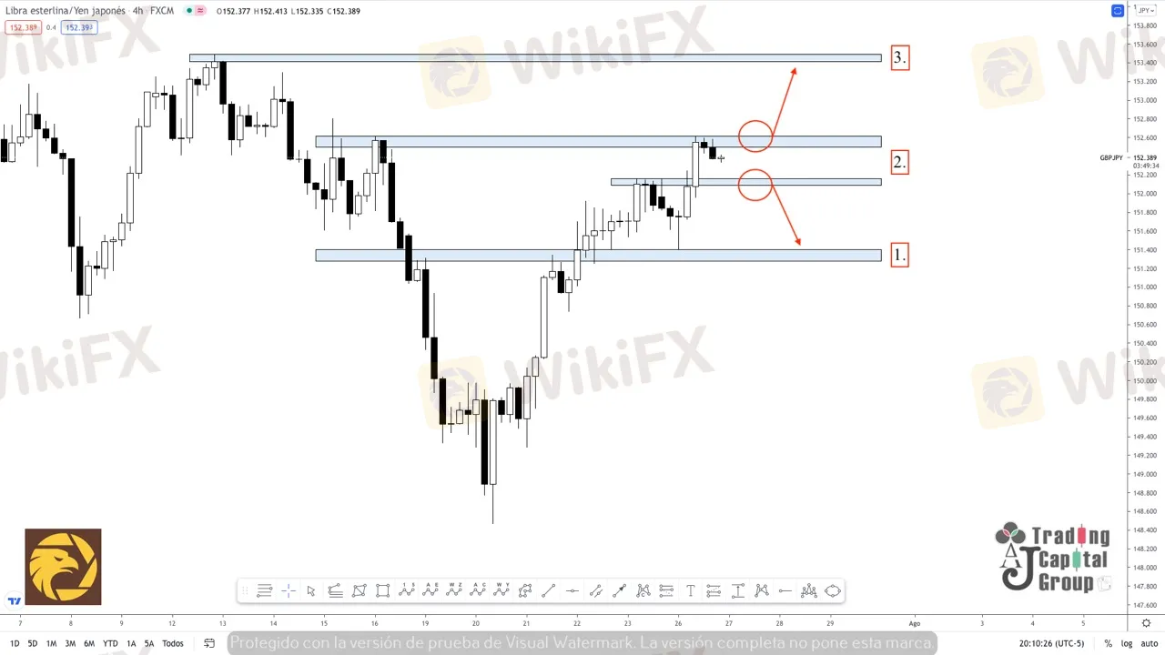 2. Así pues y teniendo en cuenta el movimiento general del precio, esta zona se establece como un rango adecuado para que ubicar 2 posibles escenarios. De consolidarse un rango de compra el precio rompería la resistencia previa para ubicar su objetivo cerca de los 153.450. Por el contrario, de ganar fuerza el escenario de venta podría crearse un rango de venta que lleve al precio a retestear la zona (1) para crear una zona de participación alcista aun mas grande.