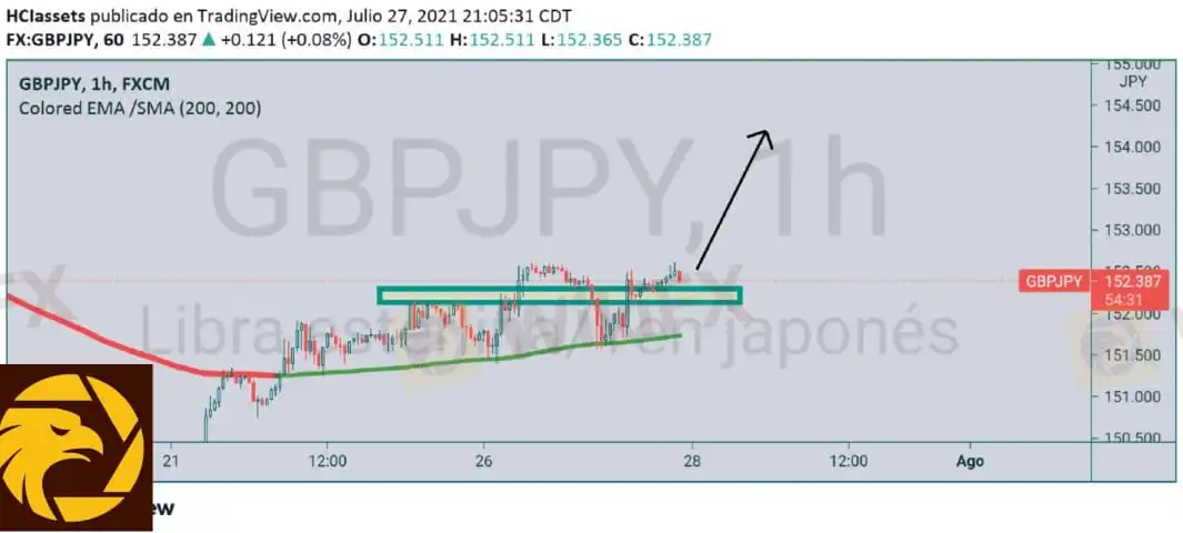 GBPJPY vemos como la EMA de 100 períodos se mantiene a la alza mientras que el precio se aleja con timidez de la zona de resistencia por por lo que buscaremos comprar a partir del precio 152.487