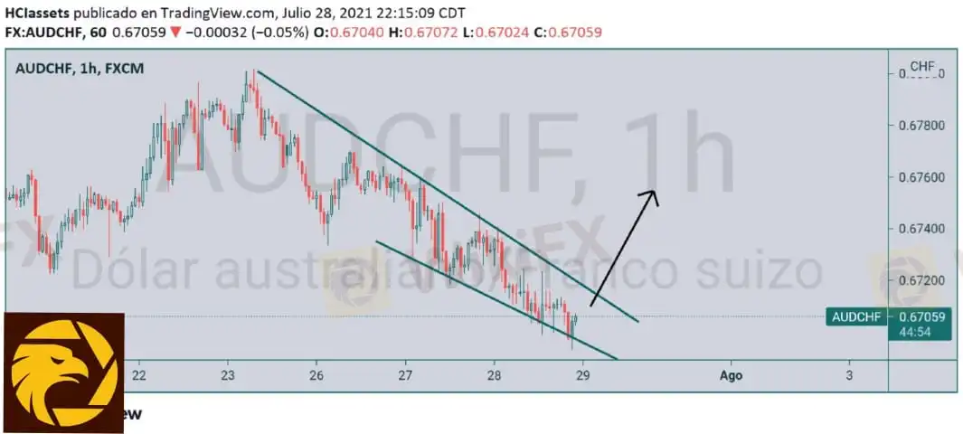AUDCHF vemos como el precio luego de su gran bajada comienza a estrecharse tan pronto ocurra una ruptura con fuerza a la alza tomaremos compras a partir del precio 0.67150