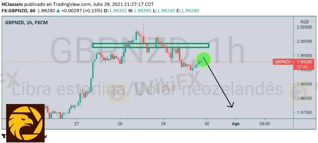 GBPNZD vemos el precio formando un HCH o mejor conocido como hombro cabeA hombre que finaliza su tendencia alcista de un mes entero en esta ocasión buscaremos ventas a partir del precio 1.99100