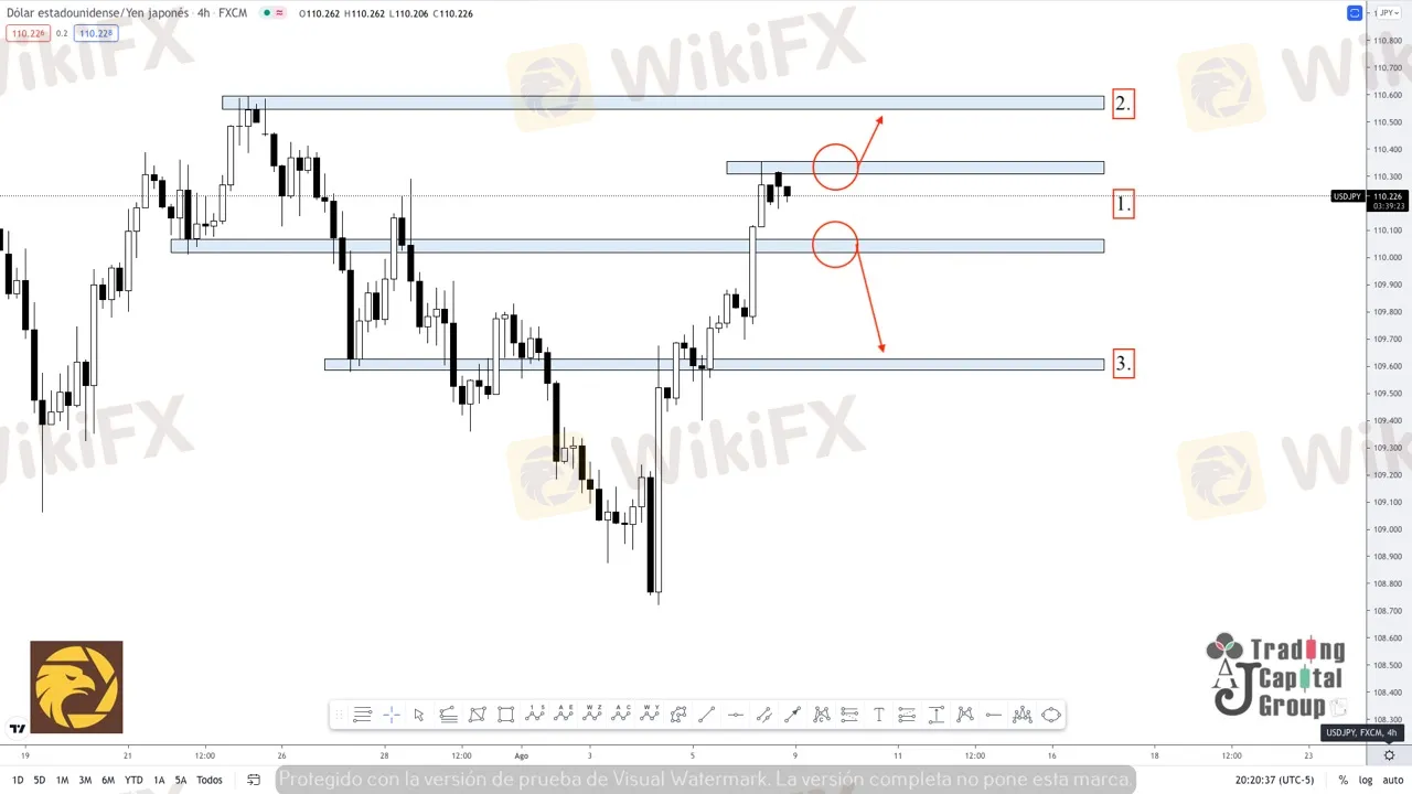 1. El precio se encuentra creando una zona de distribución que le permitiría a este activo crear un momento correctivo que llegue a las zonas (2) o (3) respectivamente. Sin embargo, de mantener su impulso alcista este nivel se consideraría como una zona de participación alcista, llevando el precio hasta la zona del rango de los 110.600 (2). Como zona previa de acumulación, este nivel podría considerarse como una zona de ganancia importante para el impulso de venta.