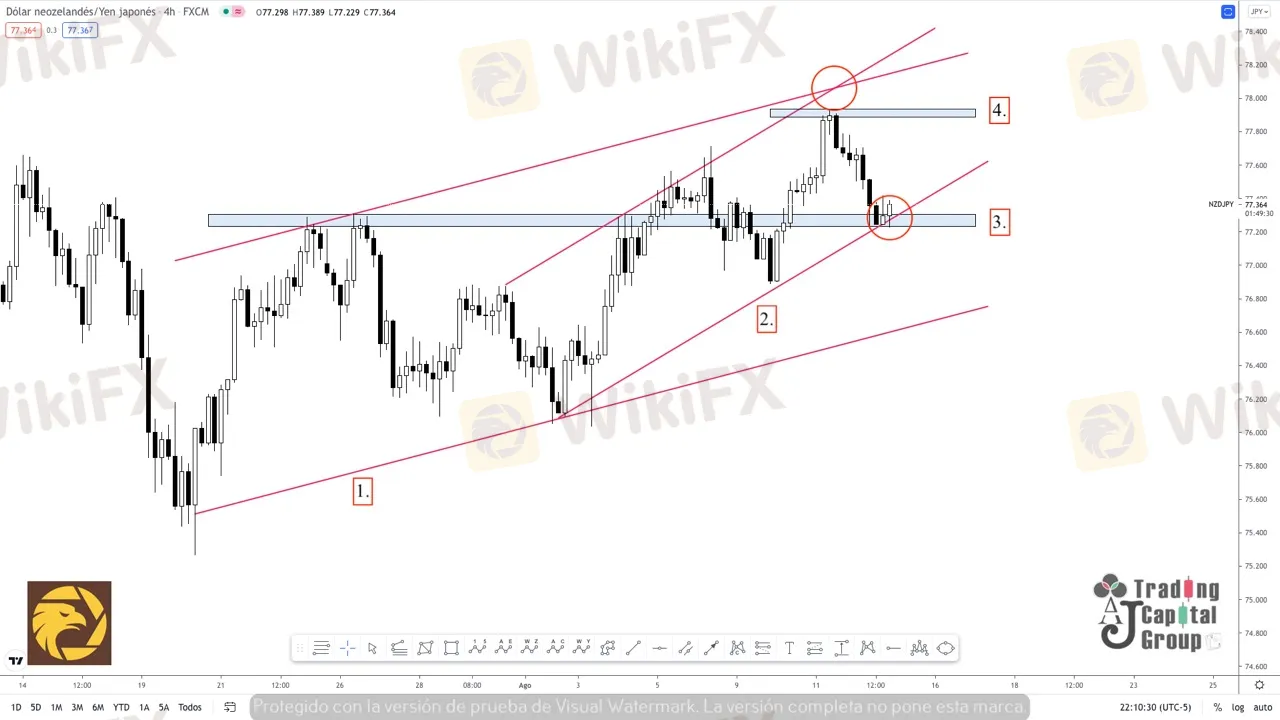 3. Esta zona se consolida como un nivel en el que el precio se establece como gatillo para una de 2 posibilidades. Por un lado, mantener una continuación hasta la zona de resistencia (4) empujando el precio hasta el punto de cruce de los 2 canales alcistas. Y por el otro, crear una estructura de venta que le permita al precio llegar la base del canal de la tendencia superior y crear un tercer toque en ella.