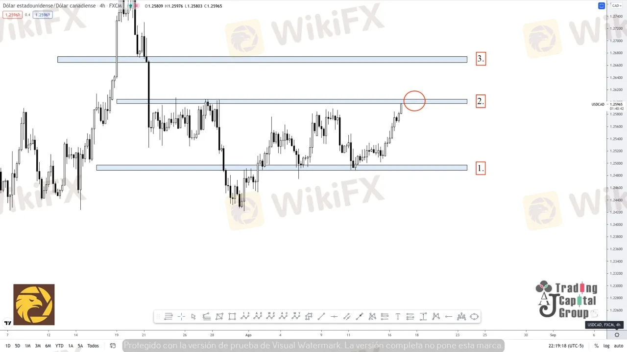1. El precio se encuentra creando un trafico de velas importante sobre la zona de los 1.24800 Por ende se presentan 2 escenarios posibles. Por un lado de cerrar con una vela bajista por debajo deL nivel (2), se podría aprovecha un movimiento en venta hasta las zonas (1). Por el contrario, si cierra con una vela alcista, por encima de este nivel, se estaría esperando un escenario de cambio de tendencia, en el que se debería esperar un retesteo de esta zona, para dejar que el precio vuelva dentro del rango de distribución previo y continue con su impulso alcista general.