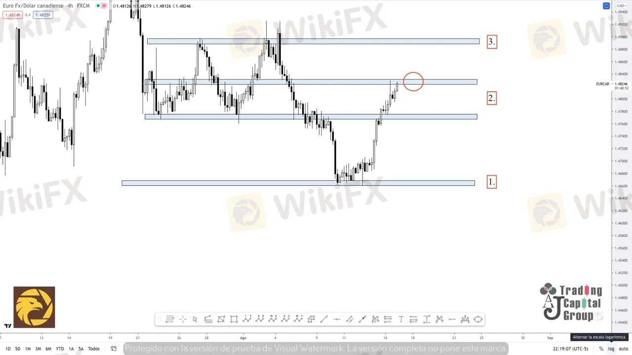 1. El precio se encuentra creando una zona de distribución que le permitiría a este activo crear un momento correctivo que llegue a las zonas (2) o (3) respectivamente. Sin embargo, de mantener su impulso alcista este nivel se consideraría como una zona de participación alcista, llevando el precio hasta la zona del rango de los 1.49000 (2). Como zona previa de acumulación, este nivel podría considerarse como una zona de ganancia importante para el impulso de venta.