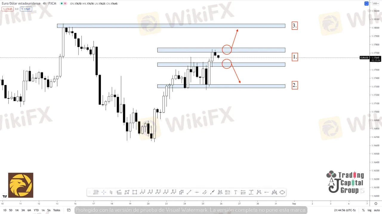 3. Por su parte, de conservar el impulso de compra, el precio podría llegar a crear una estructura de compra, por encima de la zona (1) y crear un recorrido alcista hasta este nivel. Consolidado en una resistencia semanal.