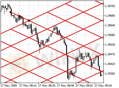 La siguiente imagen muestra como se ve la cuadrícula de Gann en un gráfico de precios: