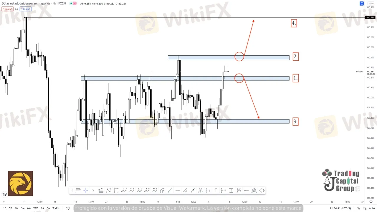 3. Ultimo nivel importante en el que el precio freno el impulso de venta para consolidar su participación alcista desde un rango de acumulación. De recuperar volumen y romper con fuerza esta zona, el precio podría llegar hasta los 109.750 Aproximadamente (4)