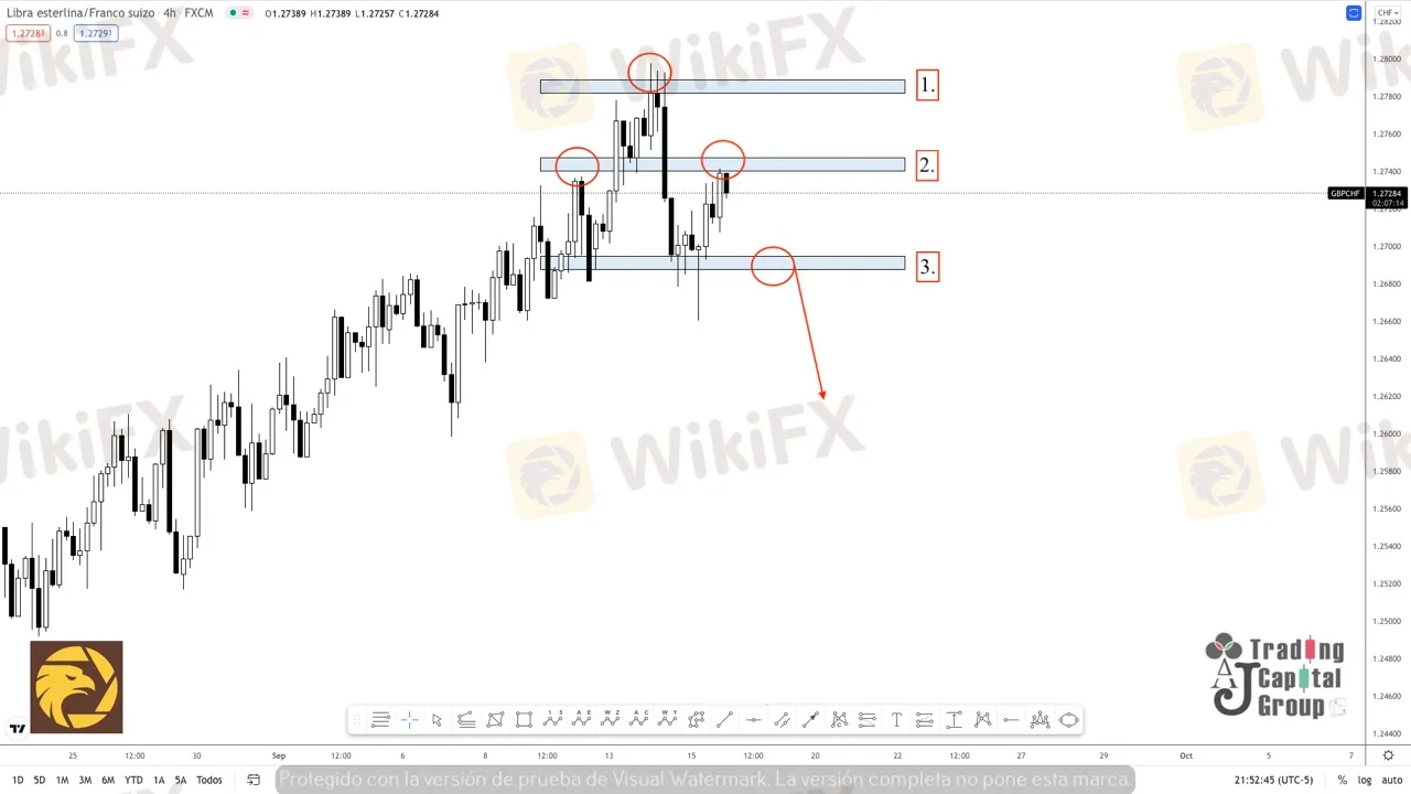 3. Así pues, de completarse la estructura (H-C-H). Este nivel podría determinar el punto de entrada en venta del precio, pues es en la zona de los 1.26800 que aparece la linea de cuello de la estructura para consolidar dicho patrón. Y por ende, consolida su rally de venta hasta los 1.26200 aproximadamente.