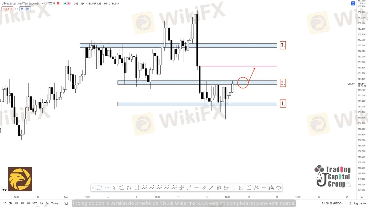 3. Por su parte, de conservar el impulso de compra, el precio podría llegar a crear una estructura de compra, por encima de la zona (2) y crear un recorrido alcista hasta este nivel. Consolidado en una resistencia semanal. Ante cualquier escenario, lo mas conveniente es esperar a ver la reacción del precio por encima de las mencionadas zonas.