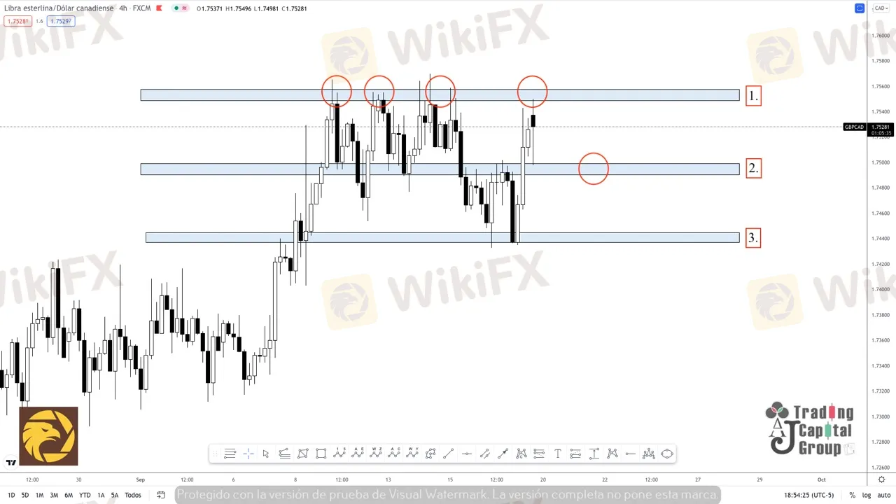 1. Una vez visto el volumen de volatilidad que se genero entre los 1.75000 y los 1.75500, en el que lo múltiples rechazos han llevado al precio a crear una zona de distribución intermedia propia de un nivel importante. De igual forma, se delimita una zona de mecha que puede tenerse en cuenta como nivel de llegada (y reacción) que puede hacer el precio. Por ende, se delimitan 2 niveles de reacción del precio, en los cuales buscaremos sus respectivos rechazos para lograr una compra o venta, según sea el caso.
