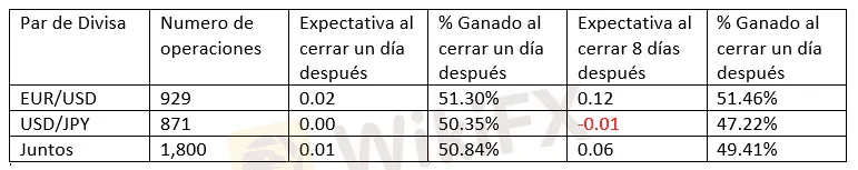 ¿En qué se basa esta estrategia? Al revisar los datos históricos desde el verano de 2001 hasta marzo de 2020, podemos ver que cuando los pares de divisas EUR/USD o USD/JPY han cerrado en nuevos máximos o mínimos de 50 días, para luego cerrar en sentido contrario al día siguiente, se observaron las siguientes estadísticas ajustadas a la volatilidad un día y ocho días después: