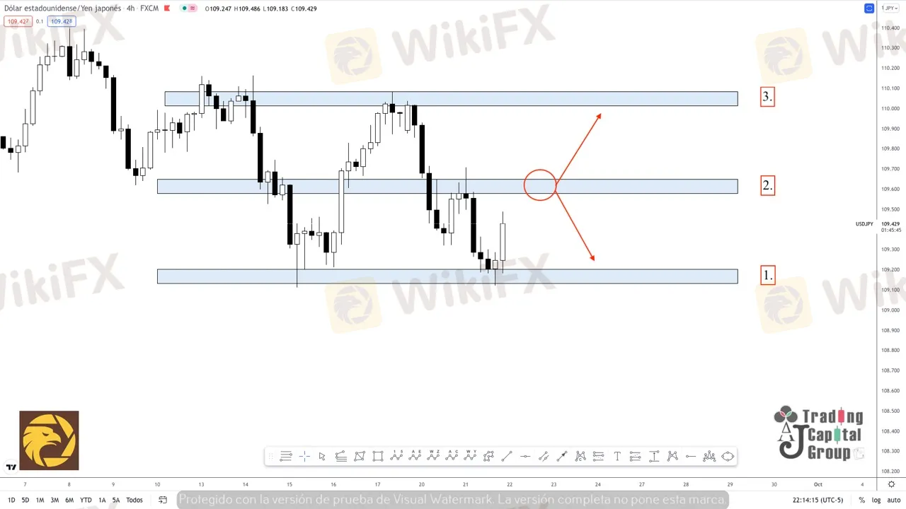 2. Teniendo en cuenta que este par detuvo el rally de compra sobre esta zona, tiende a considerarse como un nivel estratégico para tomar posiciones, siempre y cuando reaccione de forma acorde al momento general del mismo. De crearse un bajo mas bajo y un alto mas bajo, se confirmaría una tendencia de venta que podría permitir un flujo de ganancia si el precio cierra por debajo de los 109.600 (2) y por ende retestea dicha zona.