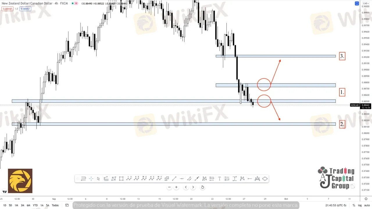 2. De romper por debajo d los 0.88500 el siguiente punto de llegada del precio, sería la zona de los 0.88100 (2) debido a que fue el ultimo nivel de participación alcista en la que se creo un impulso importante del precio.