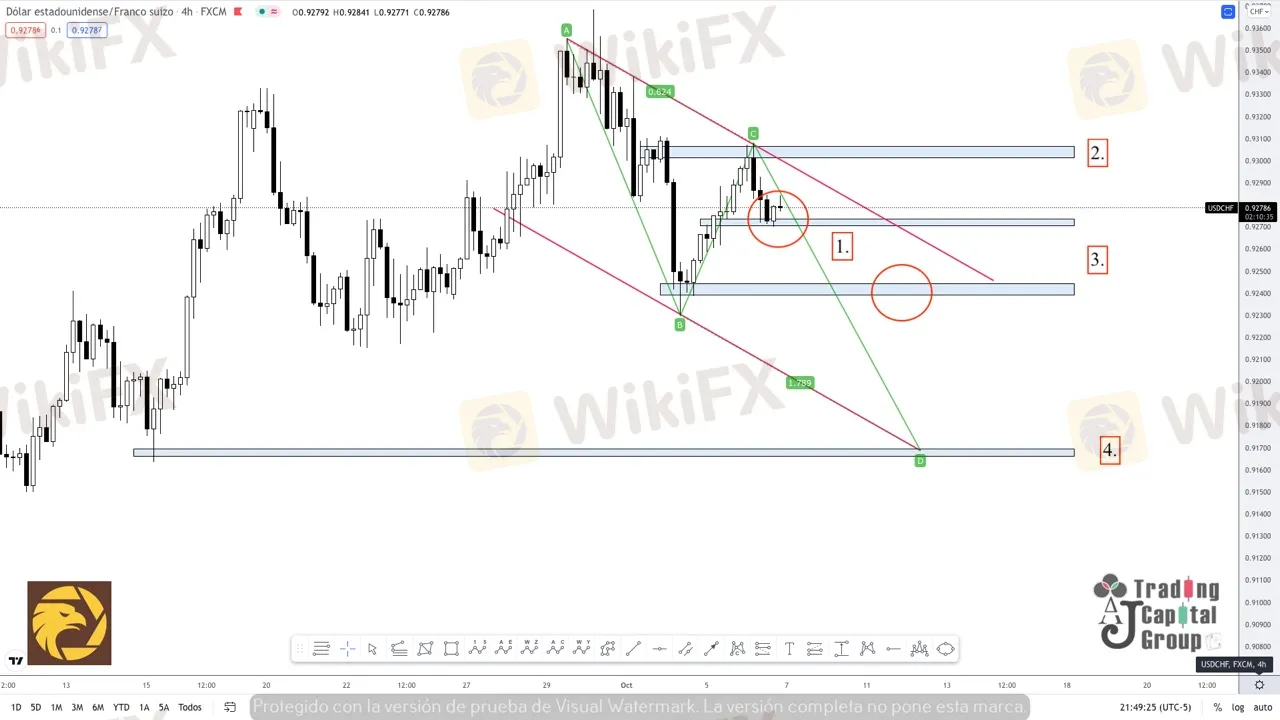 3. De continuar el movimiento bajista se buscaría pasar por debajo de esta zona para buscar un nivel de soporte delimitado sobre los 0.91650 (4) aproximadamente.