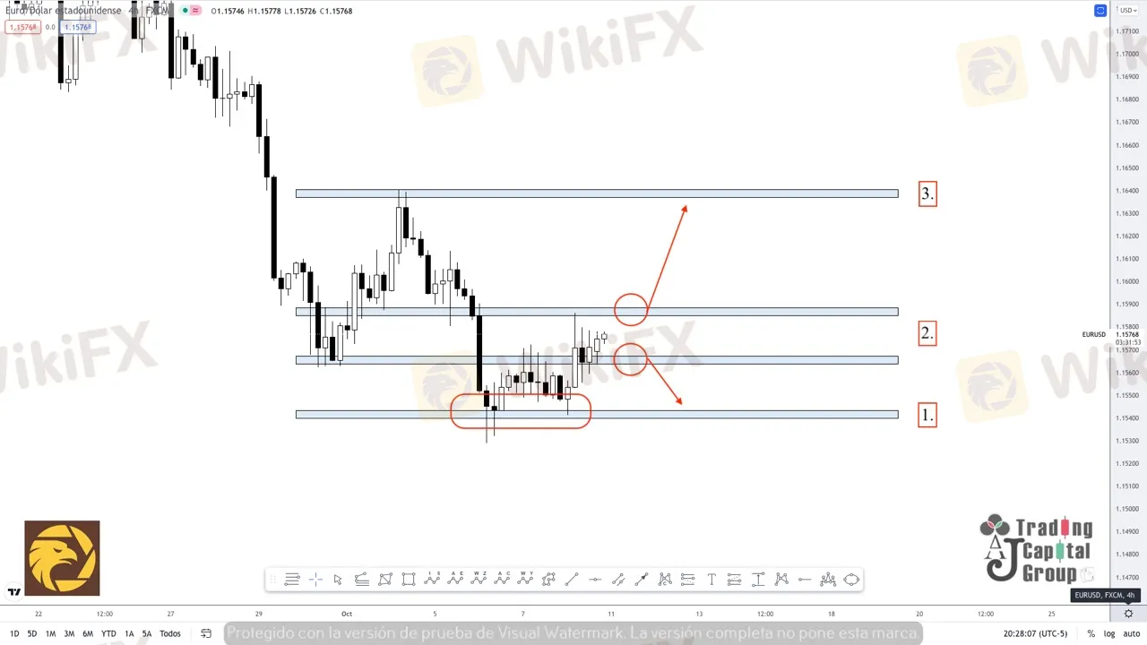 1. Luego de crear una zona de distribución (3), el precio esta en un rango de posible participación bajista, debido al movimiento correctivo general. Sin embargo, el precio se encuentra creando un doble suelo sobre la zona de los 1.15400 (1) por ende, es necesario esperar a la reacción del precio sobre dicho nivel.