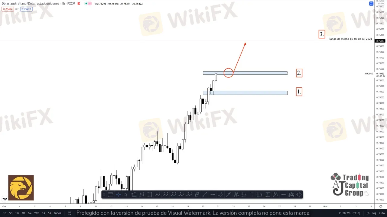3. El 5 de Julio del 2021, la vela Diaria creo un rango de mecha significativo, que le va a permitir al precio trazar un mapa de ruta del próximo movimiento. Como regla general, las mechas están hechas para ser cubiertas, siempre y cuando el precio mantenga su momentum; que es la posibilidad que se presentara dentro de las próximas horas.