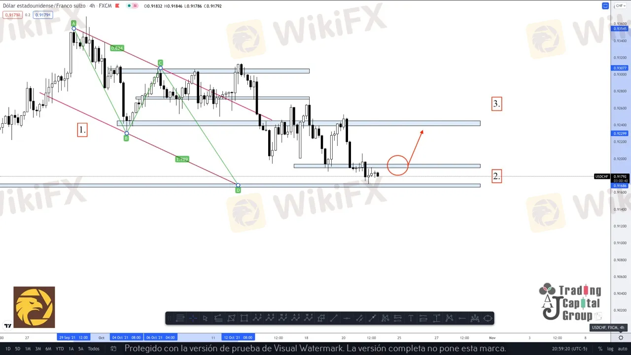2. Zona de distribución del precio da inicio a la linea de tendencia y primera zona de resistencia del precio que puede permitirle a este consolidar el inicio del patrón AB=CD. En la medida en que se consolide el precio y cree un momentum alcista, se esperaría un retesteo de esta zona para crear una oportunidad de compra hasta los 0.92400 (3).