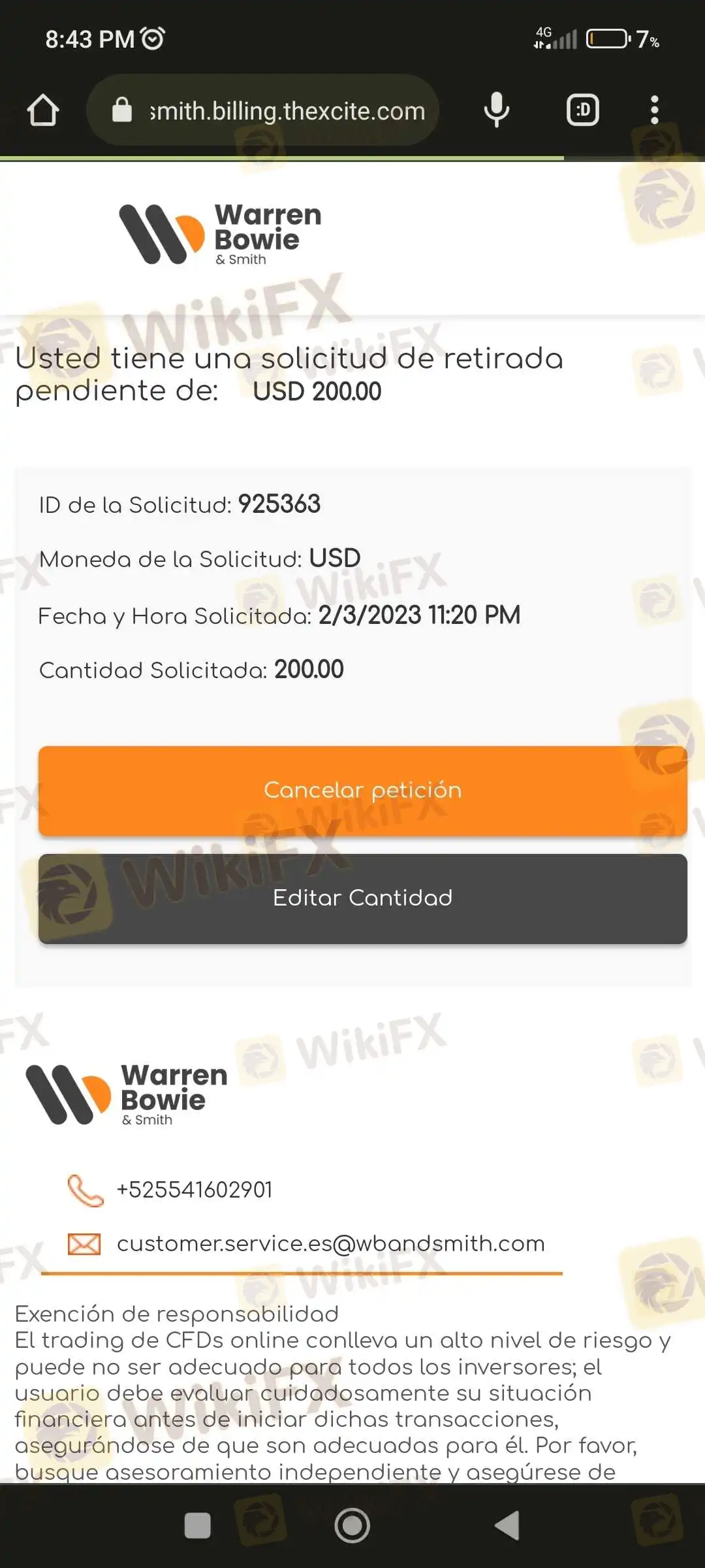 Esta ha sido la declaración de Ronny, el cual se dejó llevar por la publicidad, bastante agresiva, que Warren Bowie & Smith transmite a través de las redes sociales. Pensando que es una buena inversión Ronnie se registra en el bróker y realiza un depósito de 200 USD. Luego de realizar este depósito, Ronny decide investigar al bróker, encontrando los comentarios negativos, y es cuando decide retirarse del negocio ya que aún no había iniciado el trading y solamente estaba en la etapa de registro.