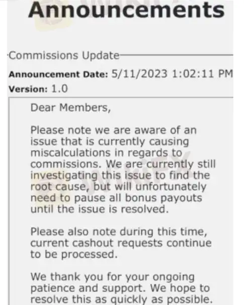 Actualmente todavía estamos investigando este problema para encontrar la causa raíz, pero lamentablemente tendremos que pausar todos los pagos de bonificación hasta que se resuelva el problema. Dice textualmente el anuncio.
