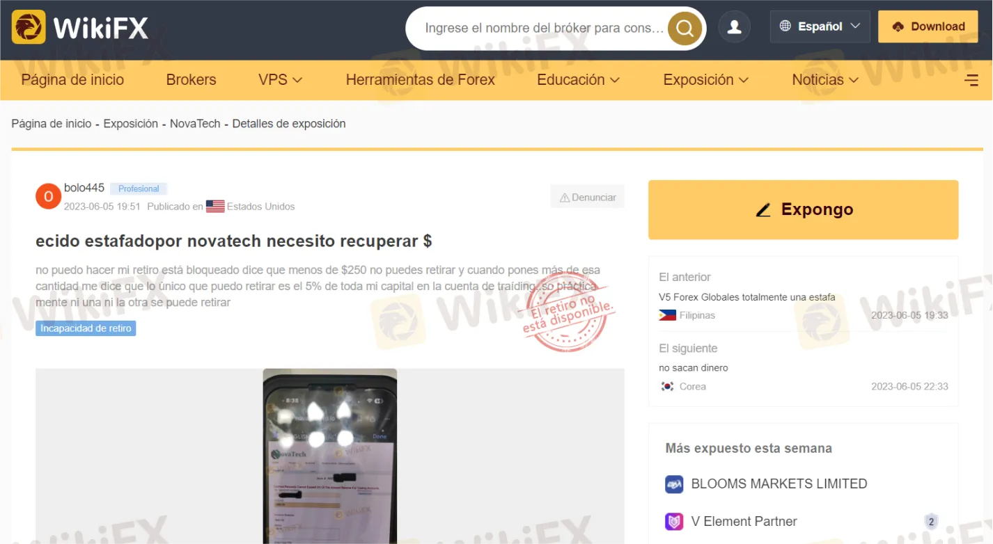 “He sido estafado por NovaTech, necesito recuperar mi dinero. No puedo hacer mi retiro, está bloqueado, dice que menos de $250 no puedes retirar y cuando pones más de esa cantidad me dice que lo único que puedo retirar es el 5% de toda mi capital en la cuenta de traiding... Práctica mente ni una ni la otra se puede retirar.”