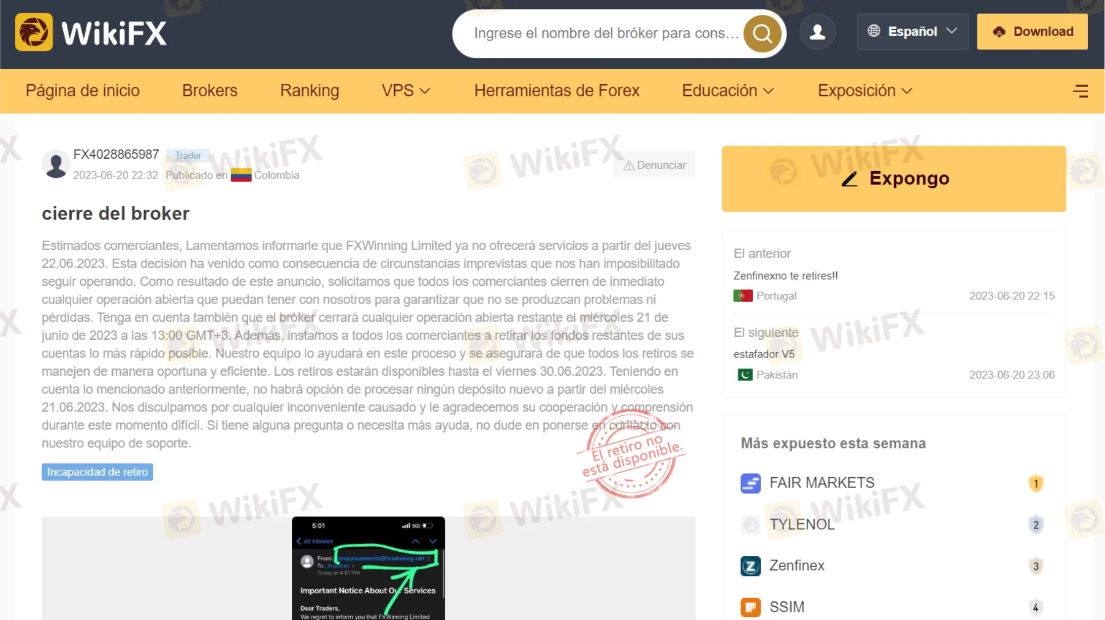 “Estimados comerciantes, Lamentamos informarle que FXWinning Limited ya no ofrecerá servicios a partir del jueves 22.06.2023. Esta decisión ha venido como consecuencia de circunstancias imprevistas que nos han imposibilitado seguir operando. Como resultado de este anuncio, solicitamos que todos los comerciantes cierren de inmediato cualquier operación abierta que puedan tener con nosotros para garantizar que no se produzcan problemas ni pérdidas. Tenga en cuenta también que el bróker cerrará cualquier operación abierta restante el miércoles 21 de junio de 2023 a las 13:00 GMT+3. Además, instamos a todos los comerciantes a retirar los fondos restantes de sus cuentas lo más rápido posible. Nuestro equipo lo ayudará en este proceso y se asegurará de que todos los retiros se manejen de manera oportuna y eficiente. Los retiros estarán disponibles hasta el viernes 30.06.2023. Teniendo en cuenta lo mencionado anteriormente, no habrá opción de procesar ningún depósito nuevo a partir del miércoles 21.06.2023. Nos disculpamos por cualquier inconveniente causado y le agradecemos su cooperación y comprensión durante este momento difícil. Si tiene alguna pregunta o necesita más ayuda, no dude en ponerse en contacto con nuestro equipo de soporte.”