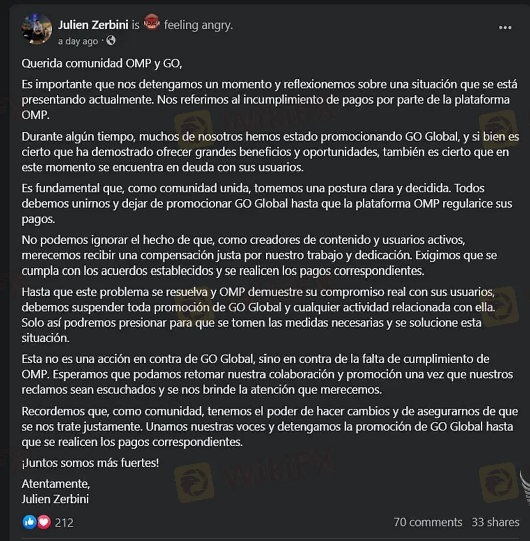 En el pasado mes de agosto, GO Global había empezado a tener problemas con los pagos a sus clientes, lo que hizo que algunos líderes de OmegaPro que ahora operaban con GO Global se quejarán de la situación, la cabeza visible de dicho grupo es Julien Zerbini, un reconocido coach y Diamante mexicano de OmegaPro, el cual hizo la siguiente declaración a través de redes sociales: