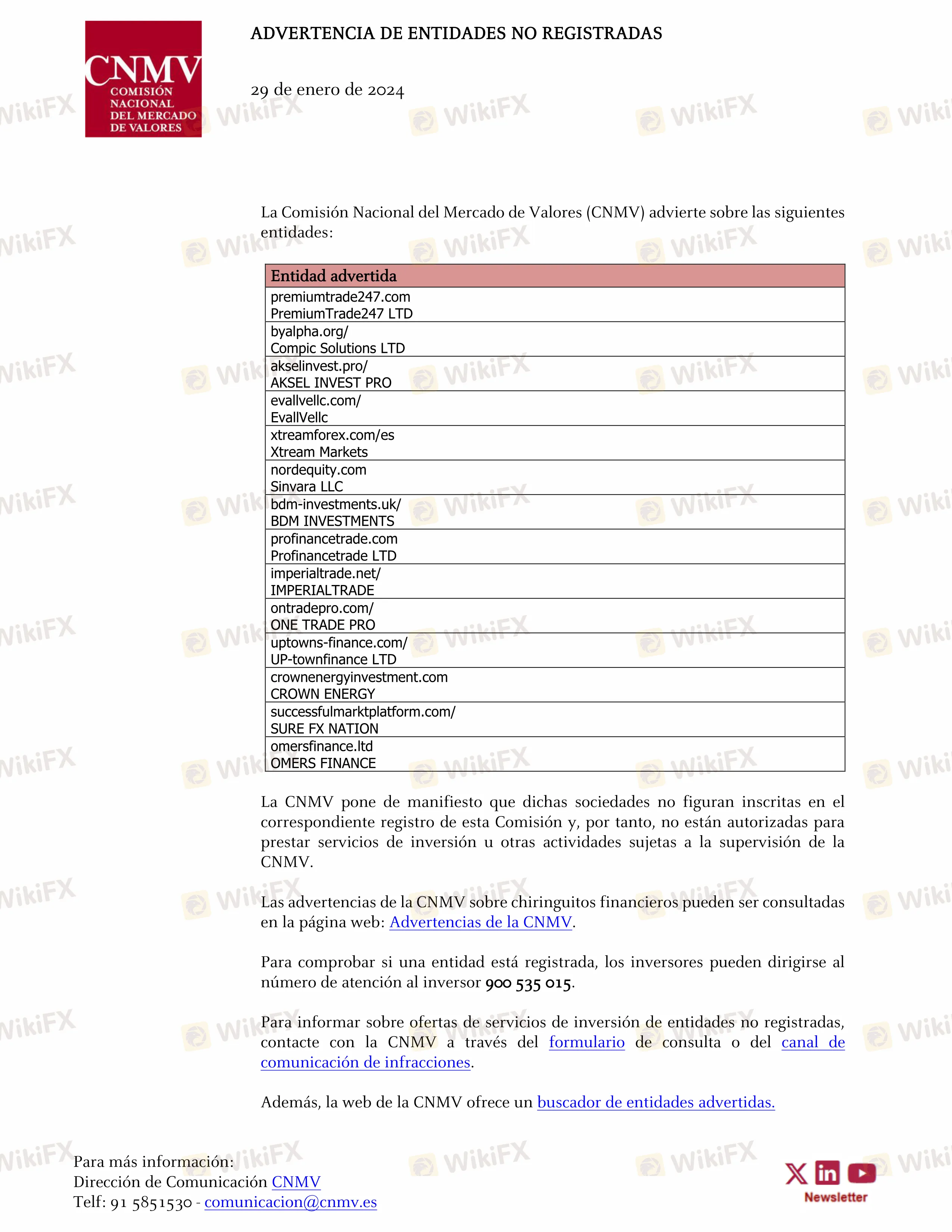 La CNMV pone de manifiesto que dichas sociedades no figuran inscritas en el correspondiente registro de esta Comisión y, por tanto, no están autorizadas para prestar servicios de inversión u otras actividades sujetas a la supervisión de la CNMV.