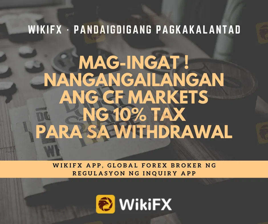 Manatiling alerto sa pekeng Tax requirements ng Forex trading, na marahil ay isang lamang itong panlilinlang ! Kamakailan lamang, ang WikiFX Exposure Platform ay nakatanggap ng maraming mga reklamo tungkol sa ganitong uri ng panloloko. Ano ang nangyari? Ang CF Markets ay isang scam? Hinahayaan natin itong malaman.