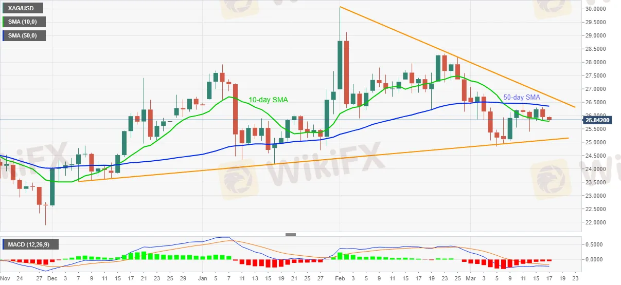 Mga Balita sa Pananalapi sa WikiFX (17 Marso 2021) - Pagsusuri sa Presyo ng Pilak : 10-araw na pagsisiyasat ng SMA ng XAG/USD bear ang pagtingin sa pangunahing linya ng suporta.