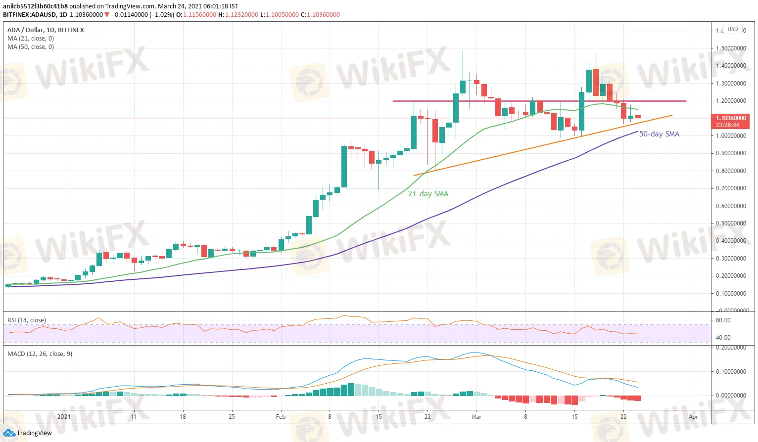 Mga Balita sa Pananalapi sa WikiFX (24 Marso 2021) - Pagtataya ng Presyo ng Cardano : Ang ADA ay bumaba patungo sa buwanang suporta ngunit ang karagdagang mga pagkalugi ay tutulan.