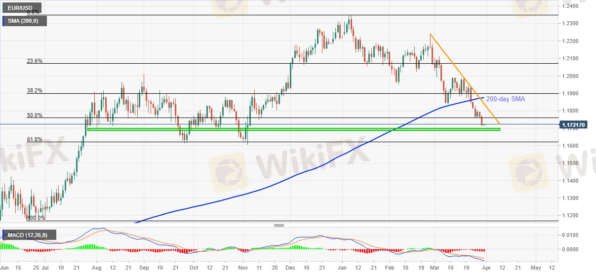 Ang EUR/USD ay nakakakuha ng mga bid sa 1.1722 habang pinagsasama ang kamakailang mga pagkalugi sa session ng Asyano noong Miyerkules. Kahit na, pinapanatili ng quote ang downside break ng nakaraang araw na 50% na antas ng pag-redirect ng Fibonacci ng Hunyo 2020 hanggang Enero 2021 na paitaas.