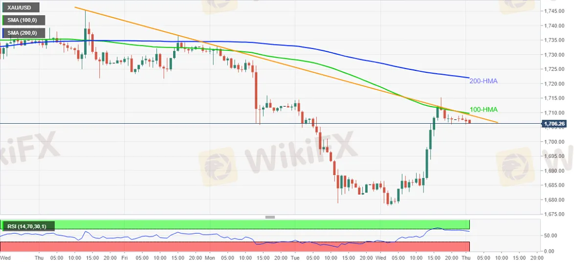 Ang mga presyo ng ginto ay bumaba sa $ 1,706 sa pinakabagong pullback sa unang bahagi ng Huwebes. Ang mga pagkabigo ng dilaw na metal upang pahabain ang paggaling ng nakaraang araw na lumilipat sa 100-HMA at isang panandaliang linya ng paglaban ay sumali kamakailan na nagpapahina sa RSI, mula sa isang overbought area, upang mapaboran ang mga nagbebenta ng intraday.