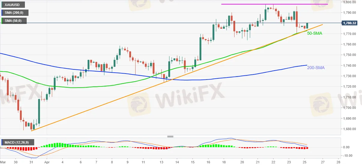 Bagaman ang bearish MACD at pagkabigo upang makuha muli ang $ 1,800 panatilihing umaasa ang mga nagbebenta ng ginto, 50-SMA at isang pataas na sloping linya ng suporta mula Marso 31, malapit sa $ 1,772-73 ay ipinagtanggol ang mga toro.