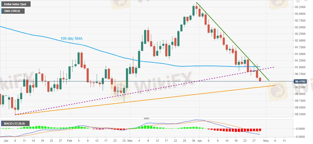 Balita sa Forex ng WikiFX (Ika-29 ng Abril taong 2021) - Pagsusuri sa Presyo ng US Dollar Index : Ang DXY ay bumaba sa siyam na linggong mas mababa habang sinabi ni Biden ang magkasanib na Kongreso.