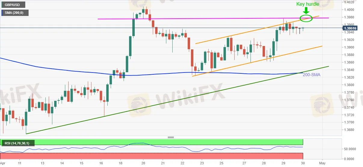 Kinukuha ng GBP/USD ang mga bid sa 1.3955, mataas na intraday na 1.3958, habang kumikislap ng 0.10% araw-araw na mga nadagdag sa unang bahagi ng Biyernes. Sa paggawa nito, ang cable ay nananatili sa loob ng isang linggong umakyat na channel ng kalakaran habang pinapanatili ang talbog sa 200-SMA na nakalarawan noong Abril 22 sa gitna ng masidhing kondisyon ng RSI.