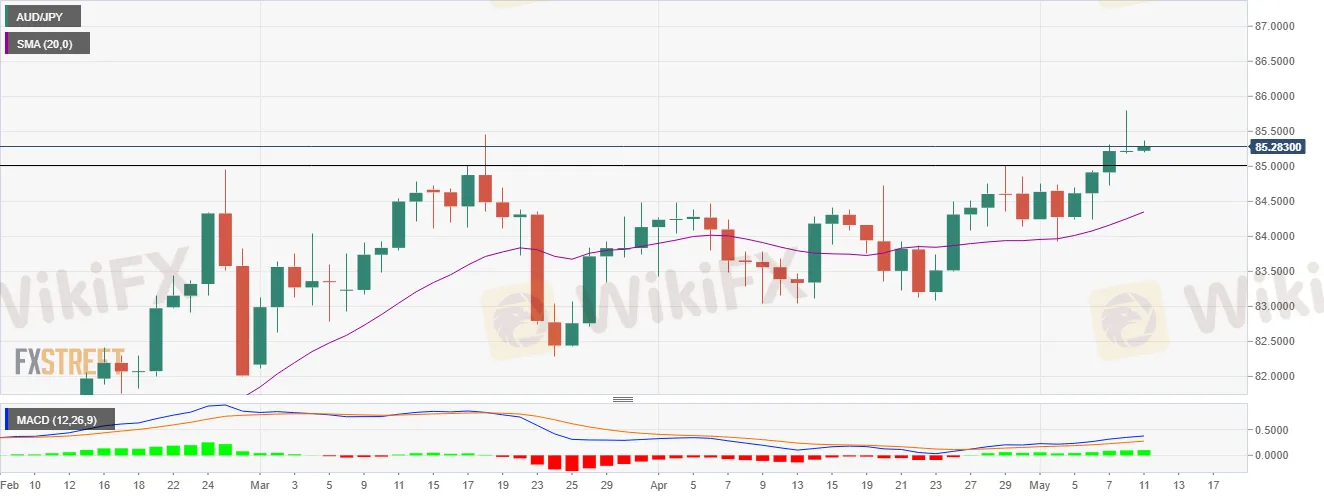 Balita sa Forex ng WikiFX (Ika-11 ng Mayo taong 2021) - Pagsusuri sa Presyo ng AUD/JPY : Mukhang pinalawak ang mga nadagdag na lampas sa 85.50.
