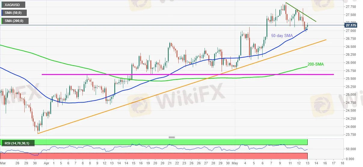 Balita sa Pananalapi ng WikiFX (Ika-13 ng Mayo taong 2021) - Pagsusuri sa Presyo ng Pilak : Ang XAG/USD ay kumupas sa pagbagsak sa 50-SMA ngunit ang salpok ng bullish ay mananatiling buo.