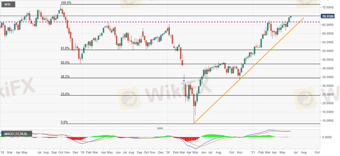 Balita sa Pananalapi ng WikiFX (Miyerkules, ika-9 ng Hunyo taong 2021) - Pagsusuri sa Presyo ng WTI : Labanan ng Bulls ang $ 70.00, ang pinakamataas mula Oktubre 2018.