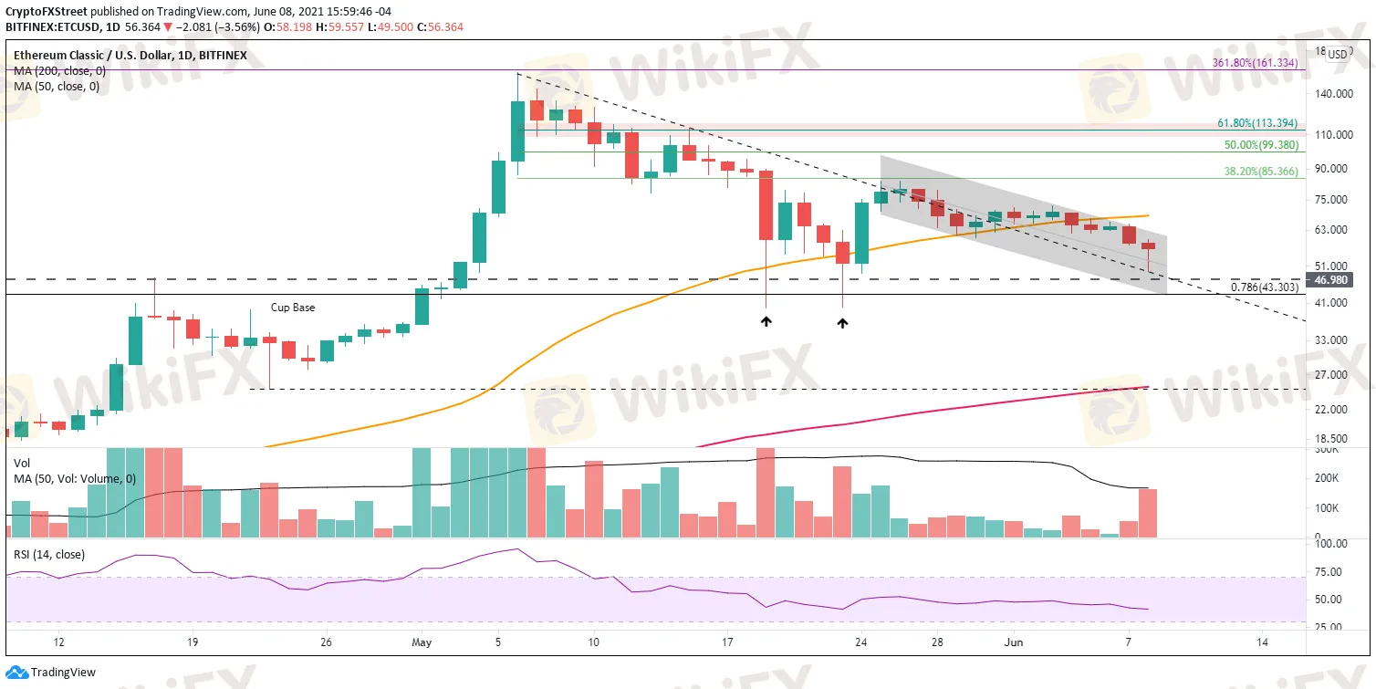 Balita sa Cryptocurrency ng WikiFX (Miyerkules, ika-9 ng Hunyo taong 2021) - Prediksiyon ng Presyo ng Ethereum Classic : Nagpapatuloy ang pagbagsak ng ETC, ngunit mag-ingat para sa isang baligtad na bullish martilyo.