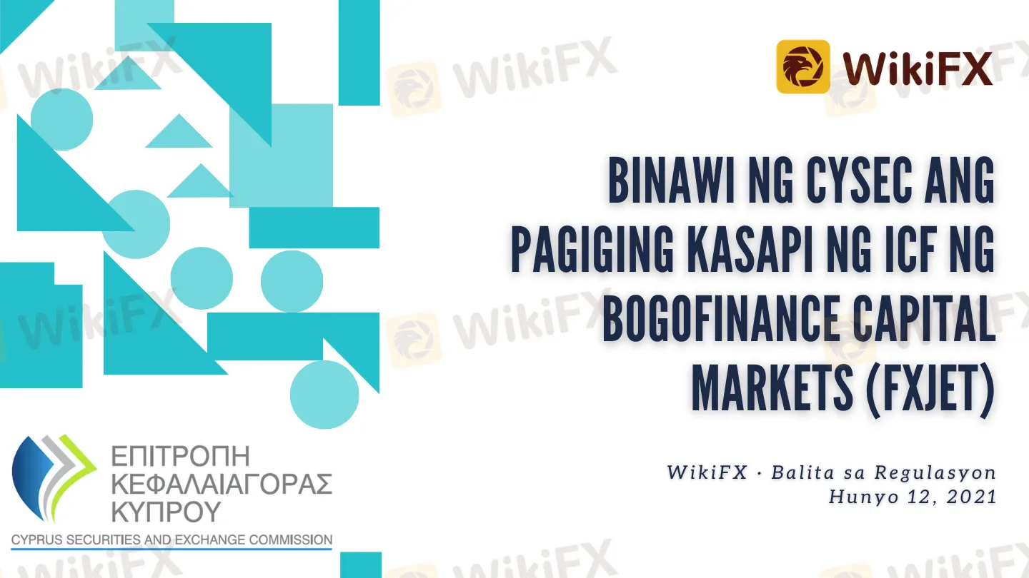 Ang Cyprus Securities and Exchange Commission (CySEC) ay inihayag noong Miyerkules na ang Bogofinance Capital Markets Ltd., na nagpapatakbo ng retail FX broker na tatak na FXJet, ay hindi na miyembro ng Investors Compensation Fund (ICF).