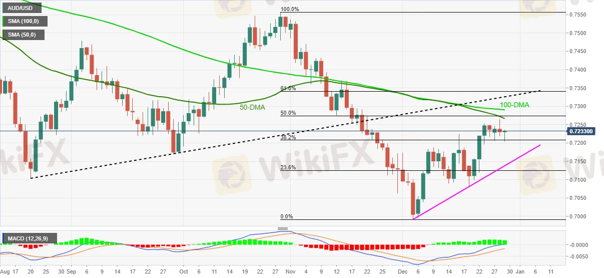 Sa paggawa nito, pinapanatili ng pares ng Aussie ang bounce sa 38.2% Fibonacci retracement (Fibo.) ng pagbaba ng Oktubre-Disyembre sa gitna ng bullish MACD.