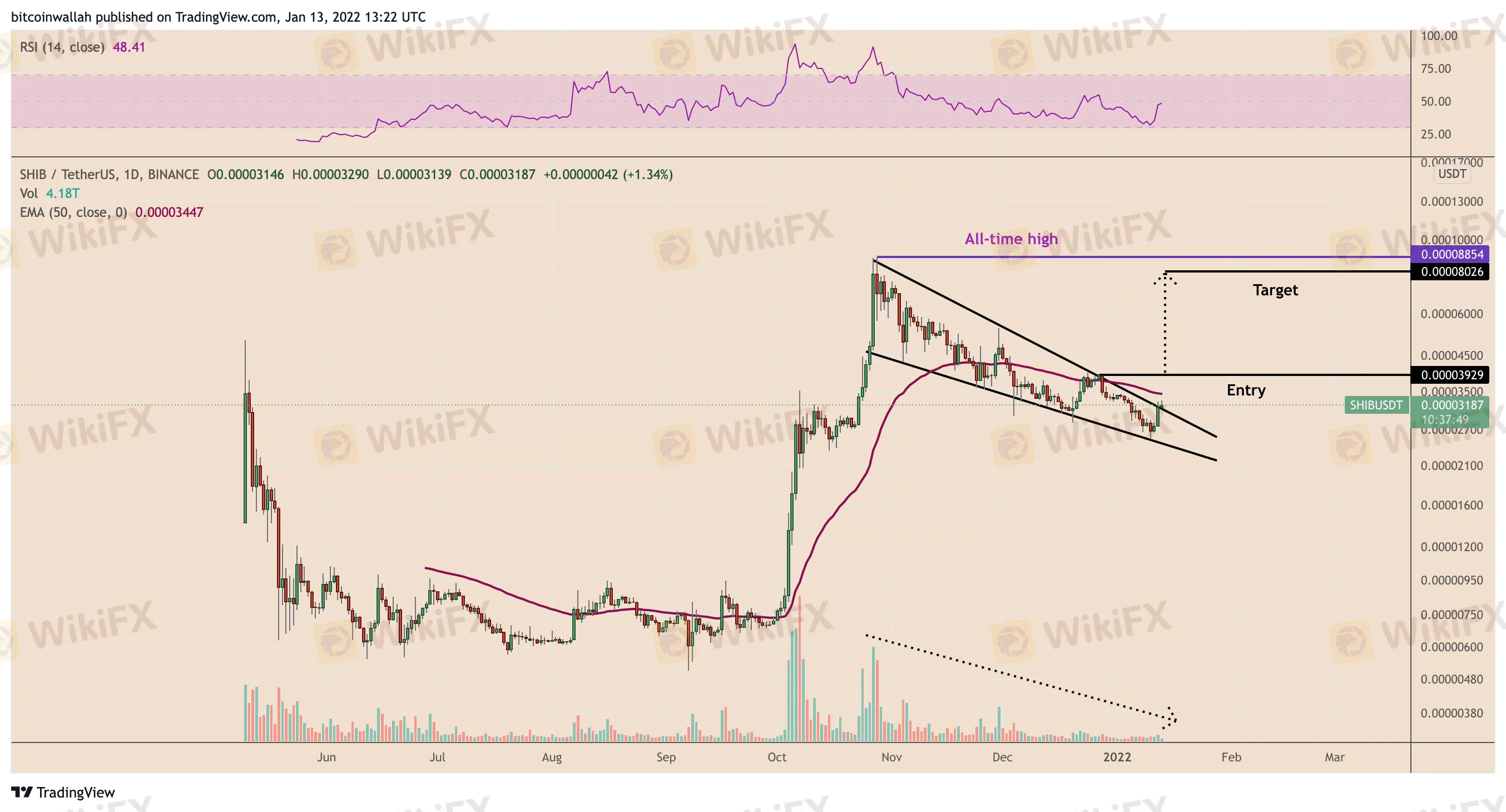 SHIB/USDT araw-araw na tsart ng presyo na nagtatampok ng bumabagsak na wedge. Pinagmulan: Fiery Trading