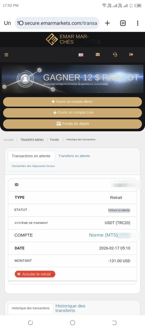 Escroquerie totale courtier Je suis en attente d'un retrait depuis le 17 février et j'attends toujours mon paiement et ils ne libèrent pas mon paiement, alors évitez cette escroquerie et Arnaque courtier s'il vous plaît, n'investissez jamais dans ce faux courtier.