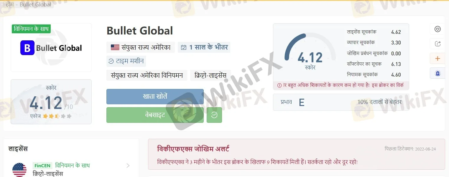 बुलेट ग्लोबल, जिसे बुलेट ग्लोबल इन्वेस्टमेंट लिमिटेड भी कहा जाता है, एक ऑनलाइन विदेशी मुद्रा दलाल है। यह संयुक्त राज्य में पंजीकृत एक नया स्थापित ब्रोकर है। WikiFX के अनुसार, यह ब्रोकर विनियमित नहीं है। उसके पास वैध लाइसेंस नहीं है। विकीएफएक्स ने इसे “नो लाइसेंस” ब्रोकर के रूप में चिह्नित किया है। 1.35/10 विकीएफएक्स द्वारा बुलेट ग्लोबल को दिया गया है, जो एक चेतावनी है कि इस तरह के ब्रोकर में निवेश करना आपकी संपत्ति के लिए जोखिम भरा है।