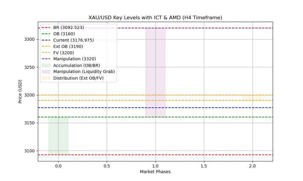 Level Kunci: $3,092.523 (Breaker/BR, support utama, warna merah). $3,160.000 (Order Block/OB, zona accumulation, warna hijau). $3,176.975 (Harga saat ini, warna biru). $3,190.000 (Extended OB, resistance, warna oranye). $3,200.000 (Fair Value, resistance, warna oranye). $3,320.000 (Manipulation high, warna ungu). Zona AMD: Accumulation: $3,092.523–$3,160.000 (zona hijau), tempat harga mengumpulkan order beli. Manipulation: $3,160.000–$3,320.000 (zona ungu), di mana likuiditas diambil. Distribution: $3,190.000–$3,200.000 (zona oranye), potensi distribusi saat ini. Entry Optimal Berdasarkan H4: Buy Entry: Lokasi: $3,160.000 (OB), zona accumulation kuat. Target: $3,190.000 atau $3,200.000. Stop-Loss: Di bawah $3,092.523. Sell Entry: Lokasi: $3,190.000 (Ext OB), zona distribusi. Target: $3,160.000 atau $3,092.523. Stop-Loss: Di atas $3,200.000. Rekomendasi: Prioritaskan buy di $3,160.000 dengan konfirmasi candlestick bullish, mengingat dukungan OB dan posisi harga saat ini mendekati zona ini. Pantau pergerakan menjelang sesi Eropa (07:00 PM WIB), karena volatilitas bisa memengaruhi breakout atau reversal note: menerima order Key level all pair forex #SetForgetProfits