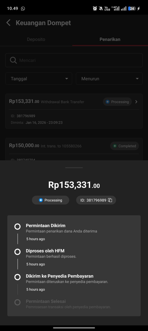Trader ini penipuan, ingin membuka posisi di MT5 tetapi tidak bisa. Kemudian Anda dapat membuka posisi di aplikasi HFM. Kemudian ada keuntungan yang mengambang tetapi tiba-tiba melaporkan kesalahan ketika ingin menghentikan keuntungan. Tiba-tiba saya kehilangan banyak uang pada tanggal 27 Januari.