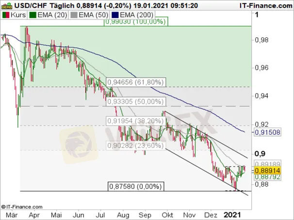 Grafik: Harga USD / CHF dalam kerangka waktu harian (Maret 2020 - Awal 2021 & Akhir 2020 - Awal 2021)