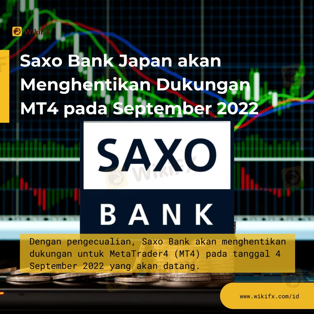 Menurut berita yang WikiFX terima, beberapa klien akan tetap dibebaskan dan dapat melanjutkan trading di MetaTrader4. Karena pemberhentian dukungan MT4 tidak akan berdampak pada platform SaxoInvestor di wilayah GCC. Dengan pengecualian pada beberapa klien tertentu, Saxo Bank akan menghentikan dukungan untuk MetaTrader4 (MT4) pada tanggal 4 September 2022 yang akan datang. Pada halaman web broker ini telah diperbarui dengan terjemahan berikut dari bahasa Jepang: